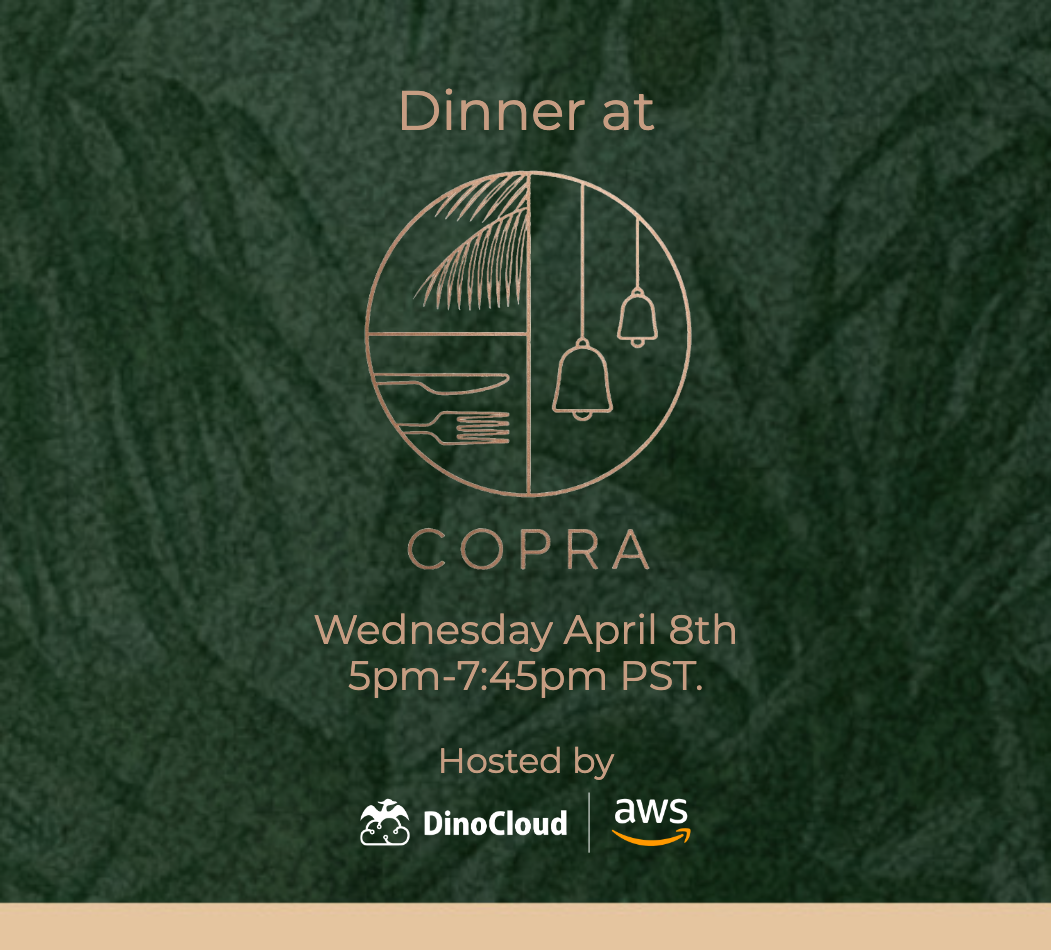 DinoCloud invites you to an exclusive, small-group dinner at COPRA in San Francisco on Wednesday, April 8th, from 5:00 PM to 7:45 PM for an evening of connection, conversation, and exceptional cuisine.